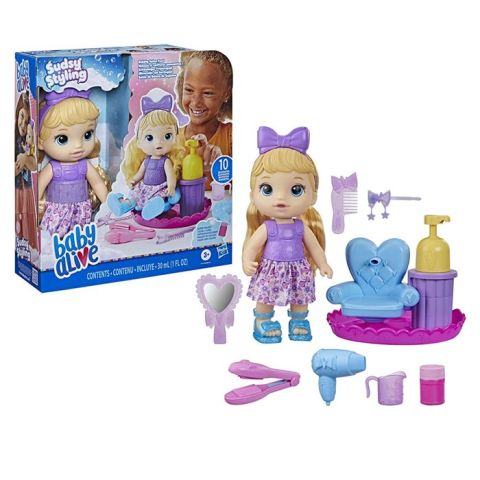 - PEK ÇOK KÖPÜKLÜ SAÇ STİLİ | Bebeğin saçını yayından çıkan köpükle şekillendirin! Baby Alive Sudsy Şekillendirme bebeği ile çocuklar, oyuncak bebeklerini tıpkı kuaföre gider gibi şekillendirici koltuğuna oturtabilir.