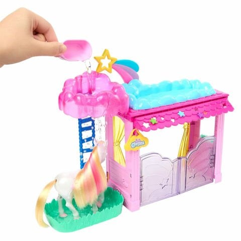 - İçerik | 1 Chelsea bebek, 1 Barbie Pegasus, 1 tek boynuzlu tavşan, 1 ahır, 1 kaydırak, iki sandalyeli 1 masa, 1 tarak ve çeşitli aksesuarlar dahildir.
