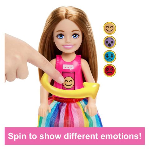 - Temalı set, Barbie® terapist bebeği ve benzersiz bir özelliğe sahip sabırlı bir bebekle birlikte gelir; çocuklar, duygularını ifade etmeye yardımcı olmak için küçük bebeğin gömleğinin üzerindeki emojiyi döndürebilir.
