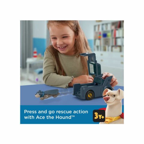 - ocuklar Süper Köpek Krypto'yu Görünmez Jet'e veya Tazı Ace'i Batmobile'a yerleştirdikten sonra şehirde 'devriye' gezmeye çıkarabilir. Lulu'nun kötü kalpli kobayları ortaya çıktığında çocuklar düğmeye basıp süper evcil hayvanları araçlarından fırlatarak günü kurtarabilir. Çocuklar, aksiyon dolu daha fazla oyun için iki figür ve araç setini de koleksiyonlarına ekleyebilir.