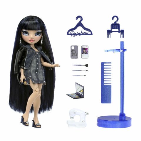 - Rainbow High bebeğinin sevimli kakülleri, mavi düz saçları, uzun gerçek kirpikleri ve cam gözleri vardır.